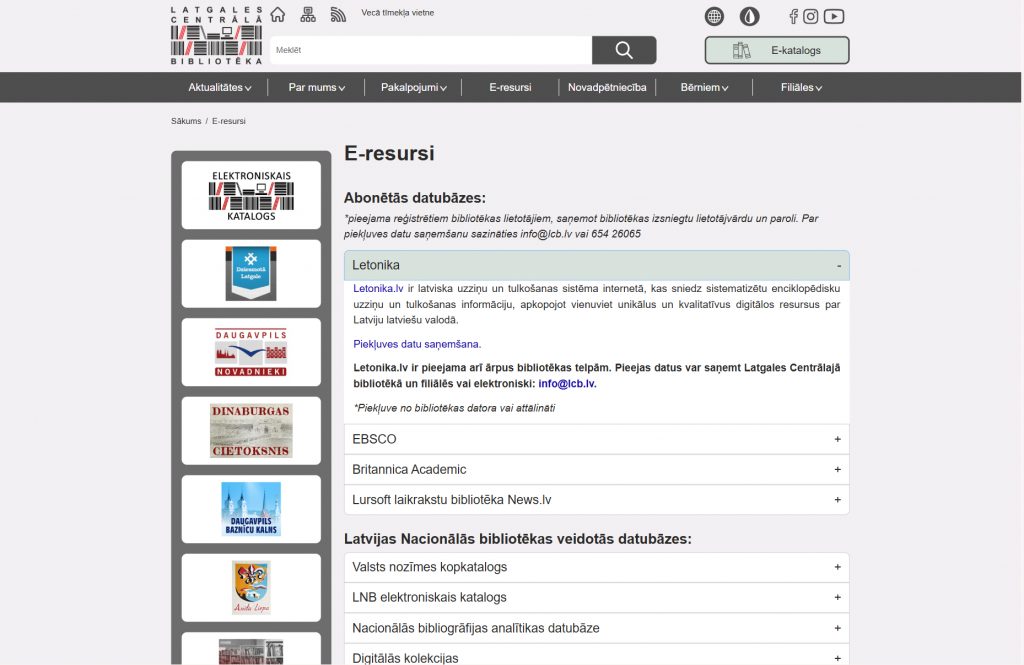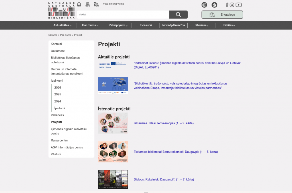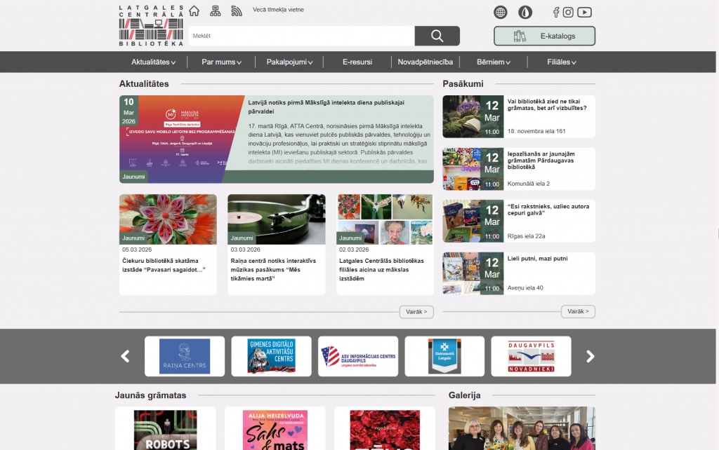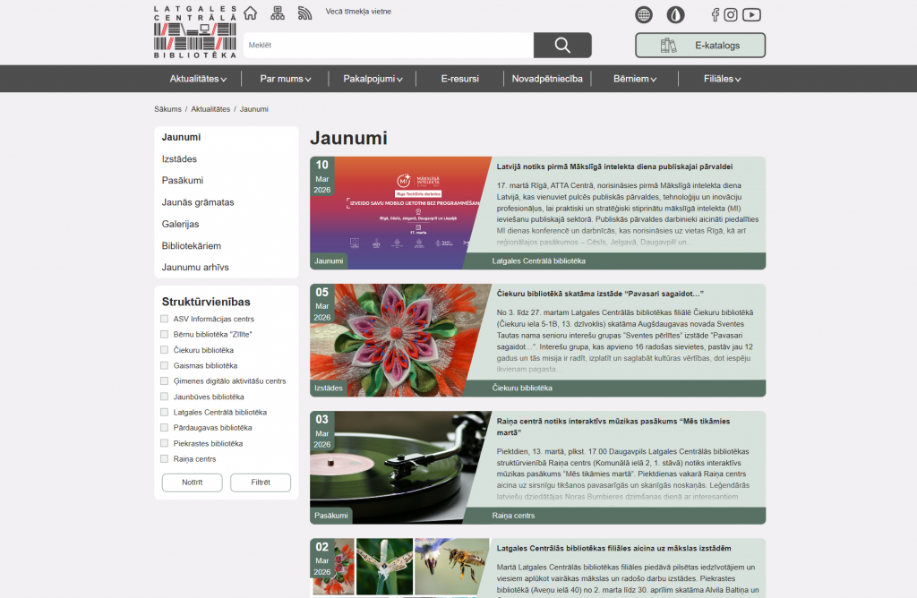 A shared website was developed for an association of six libraries and two informational structural units. The website provides both the presentation of current information and its organization according to topics and territories relevant to readers. Specific content types were created on the website, including: new books, events, exhibitions, periodicals, information for children, and others. Selected filter values and even the opened accordion sections are recorded in the website’s URL, allowing visitors to share links that lead directly to the exact information visible on their screen. Special attention was given to accessibility in order to preserve the designed aesthetic experience while also providing tools for adjusting contrast and text size, as well as making the website easy to navigate using voice commands.